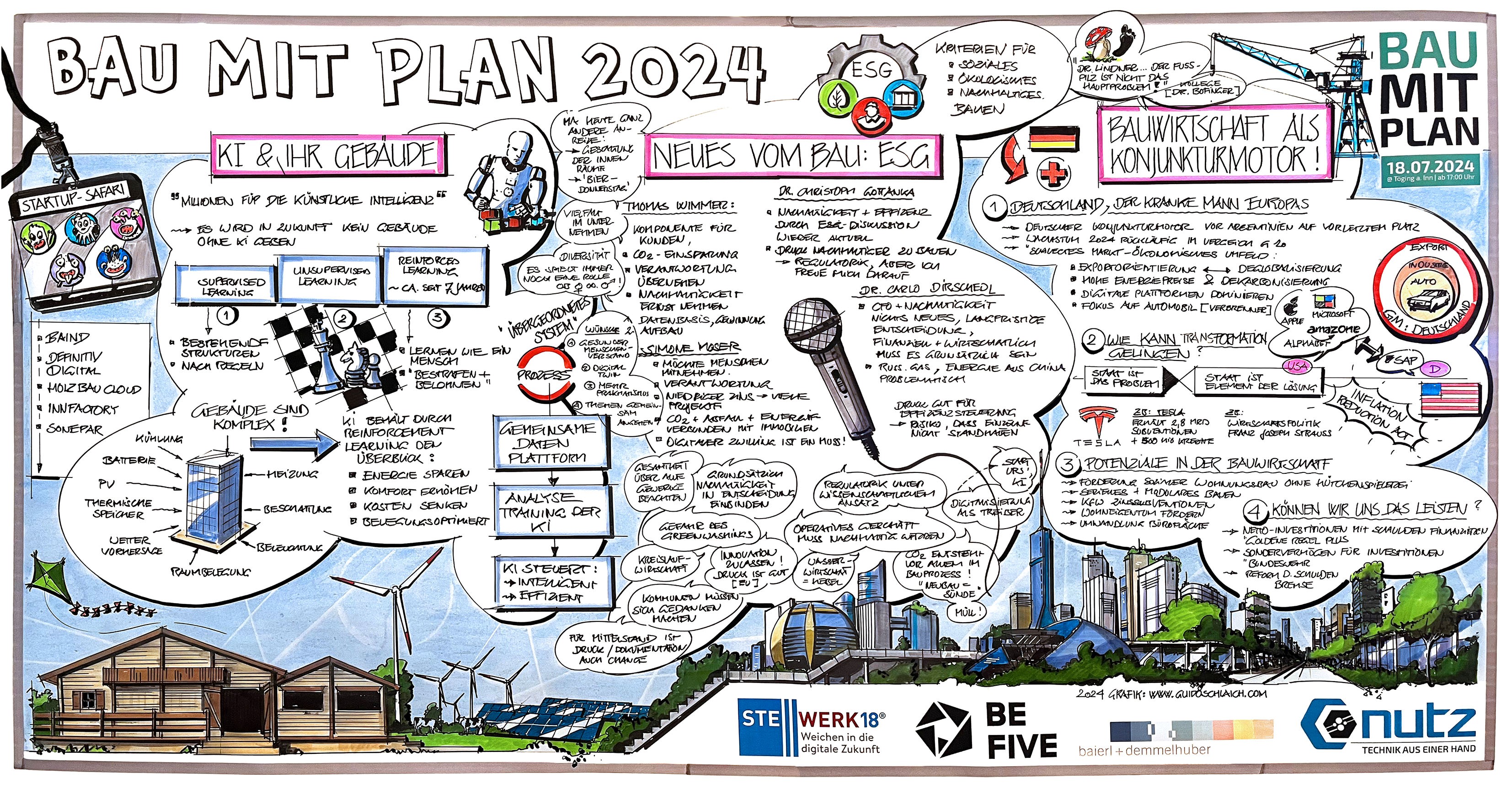 Bei BAU MIT PLAN 2024 war die kreative Visualisierung von Guido Schlaich ein echtes Highlight. Der Künstler dokumentierte live die Programmpunkte und hielt die wichtigsten Aussagen und Botschaften der Veranstaltung auf einer 2,5 qm großen Papierwand fest.